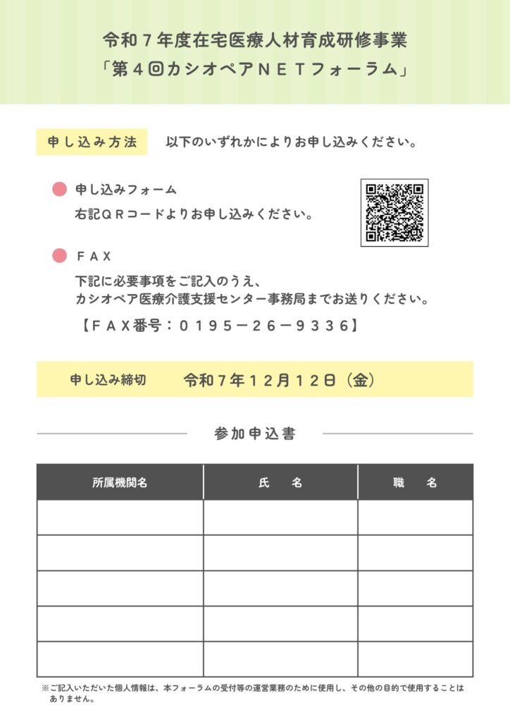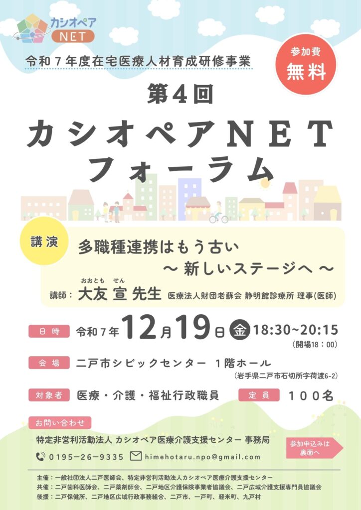 二戸医師会及び当NPO法人主催による令和7年度在宅医療人材育成研修事業「第4回カシオペアNETフォーラム」を開催いたします。